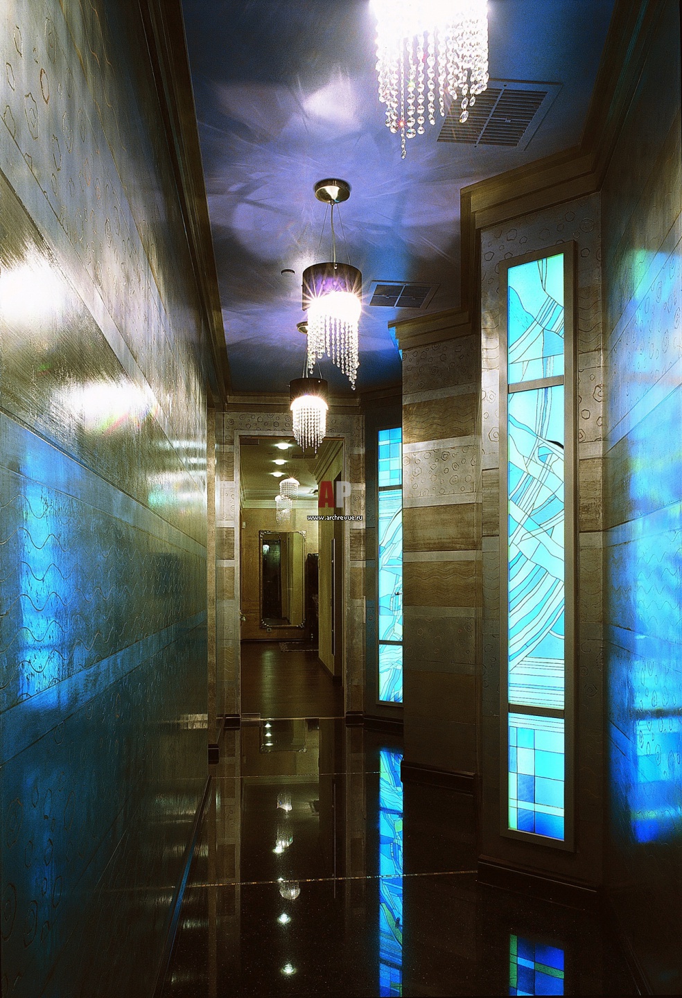 Коридор решен в сиренево-серебристой гамме. Потолок выкрашен в сиреневый цвет, стены покрыты сложным финишем с верхним слоем из матовой серебряной краски. Витражи выполнены художником Ольгой Цветковой.