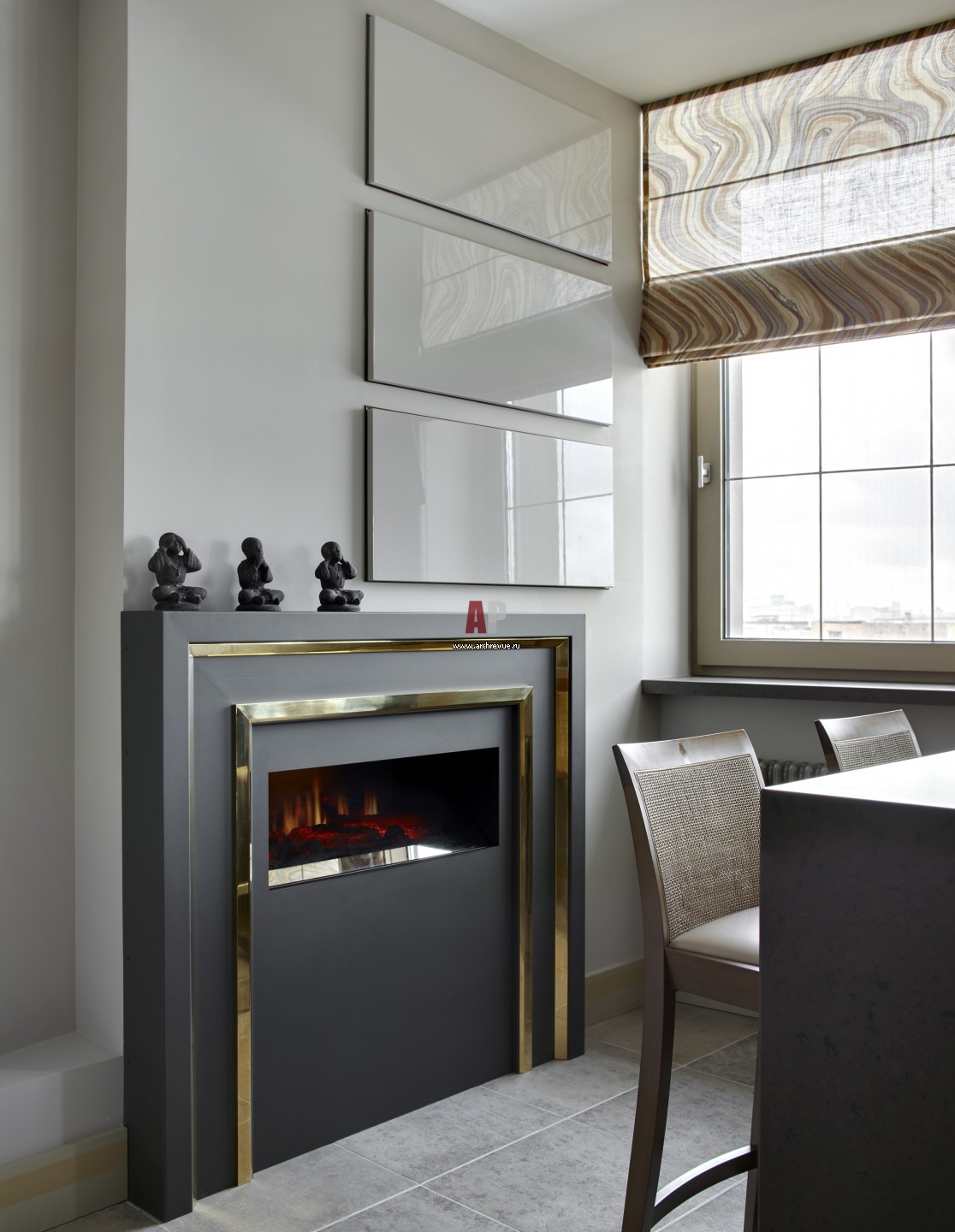 Портал электрического камина выполнен из выкрашенного в темный цвет дерева с вставкам из латуни. Три глянцевых панно над ним работают как зеркала.