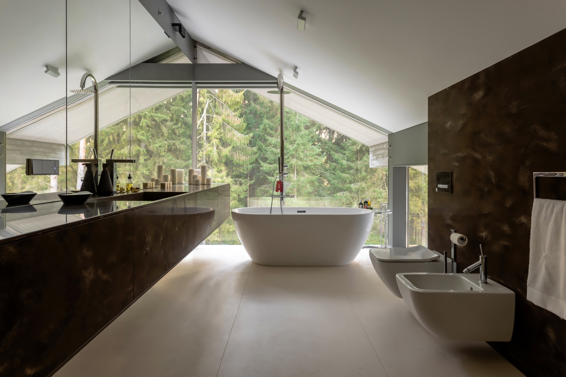 Ванная комната с панорамным окном на втором этаже. Все раковины в доме сделаны на заказ из натурального мрамора и искусственного камня Corian. Сантехника и фаянс, Antonio Lupi. Смесители, Gessi, Hansgrohe Axor Starck. Инсталляции и кнопки, Geberit.
