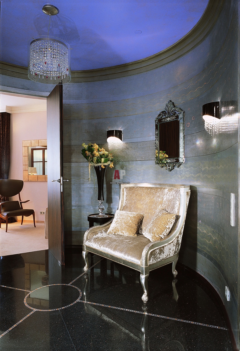 Ядро пространства – круглый холл. На полах – полированный гранит, поставщик «Базальт Керамика». Кресло Ipe Cavalli, люстра Emme Pi Light.