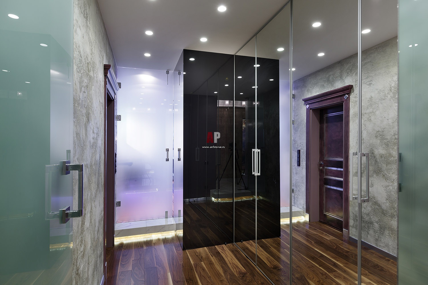 Холл, соединяющий общественную и приватную части квартиры. Стена отделана штукатуркой с эффектом бетона. Фасады встроенных шкафов, двери – зеркальные или из матового стекла.