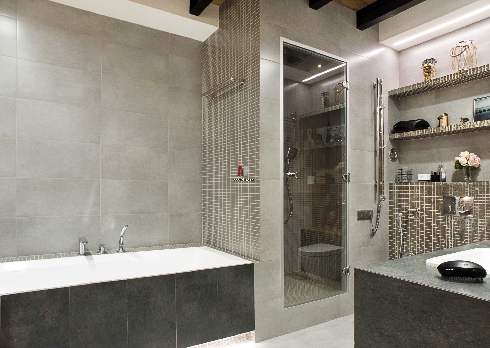 Стены в ванной комнате оформлены серым керамогранитом, торец душевой кабины, встроенные полки выделены каменной мозаикой. Ванна, Am.Pm. Унитаз, раковина, Villeroy & Boch.