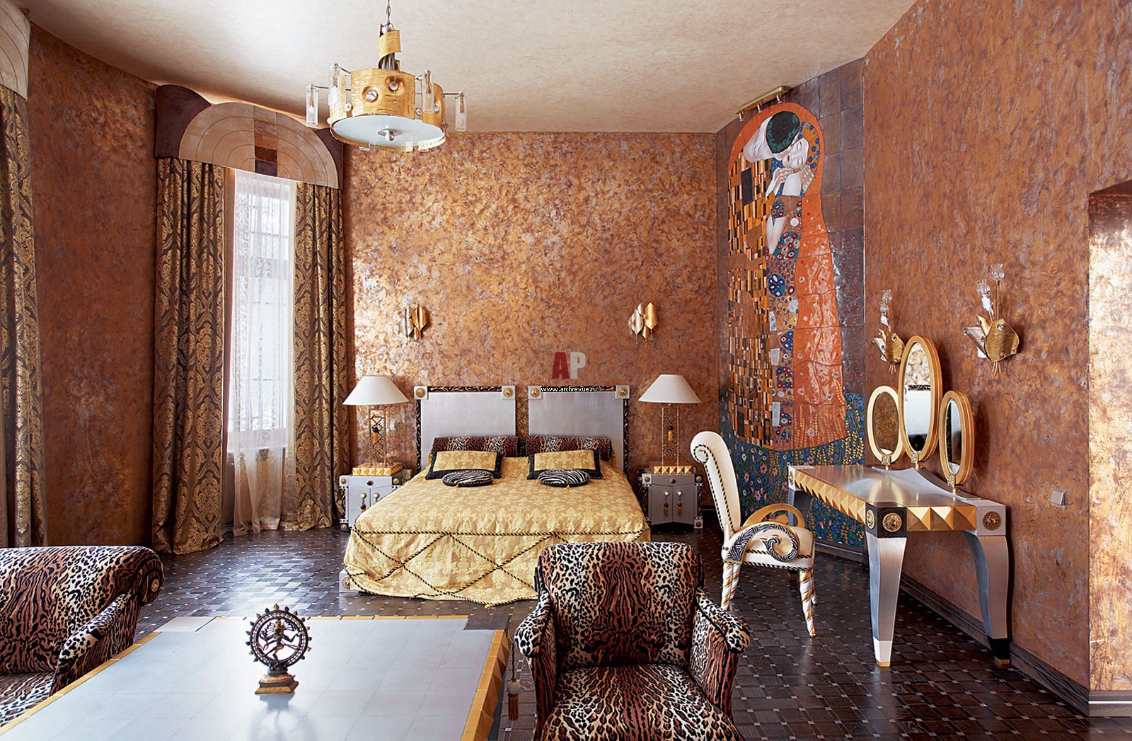 На втором этаже, в одной из трех спален хозяев, финиш стен из сусального золота, изготовитель Interior Design & Decoration, дополнен пятиметровым панно. Оно выполнено в технике горячей эмали с репродукции знаменитого полотна Густава Климта «Поцелуй» мастерами компании «Арт-студия Ивана Бондаренко».