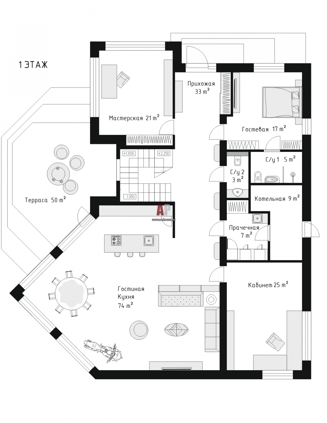 Планировка 1 этажа 2-х этажного современного дома. Общая площадь – 320 кв. м.