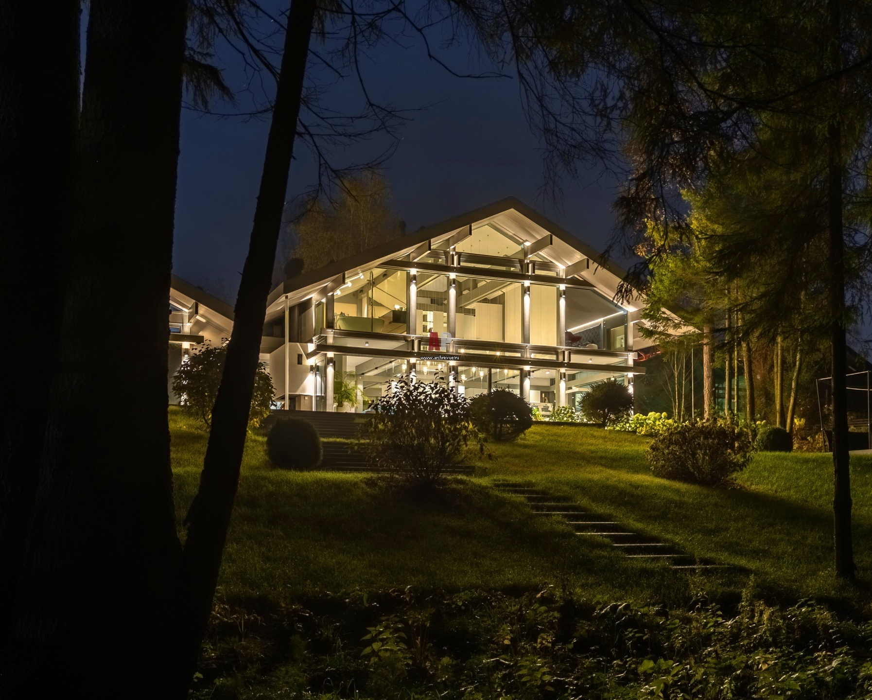 Каркасный двухэтажный дом с панорамным остеклением. Вечернее освещение.