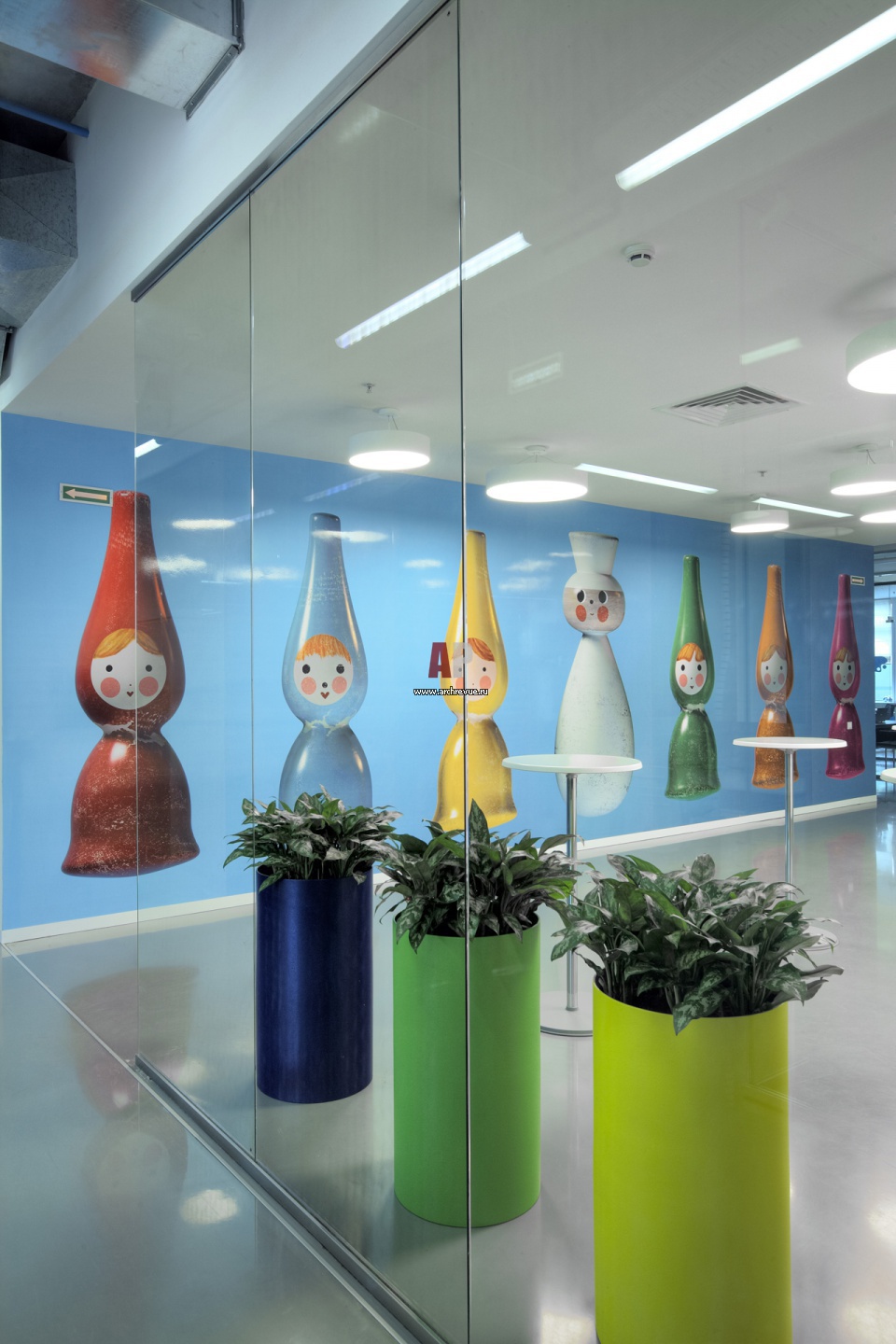 В оформлении современного офиса использовано стекло, пластик, фотообои, дизайнерская мебель и свет.