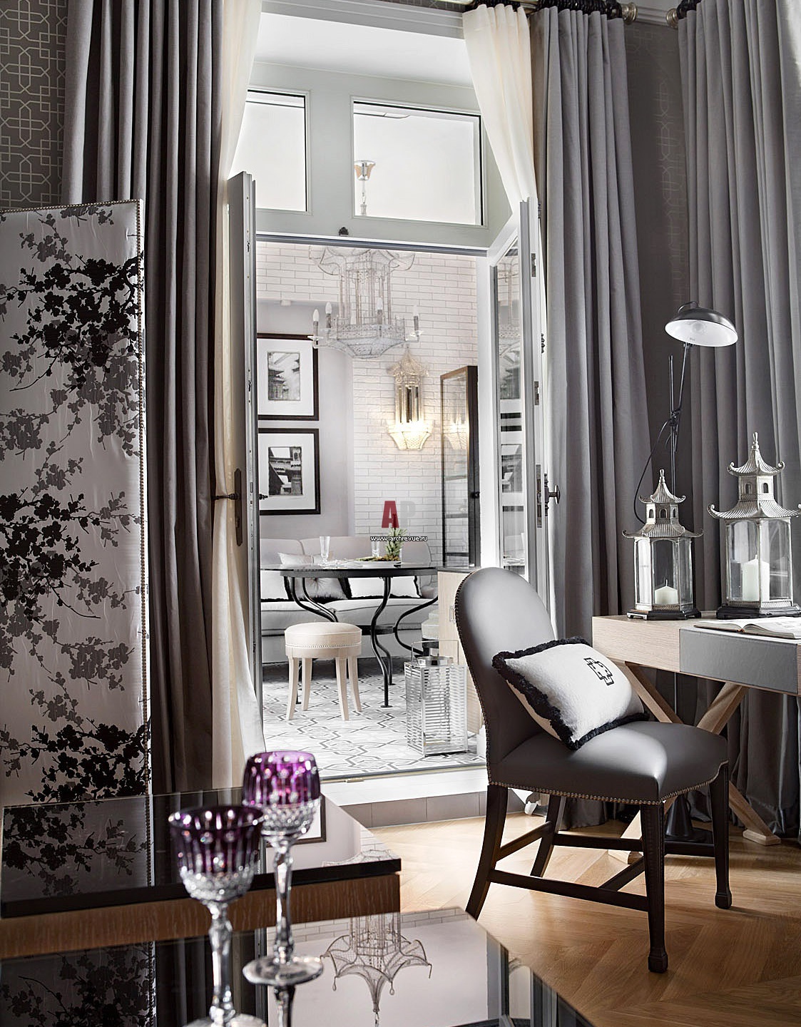 Вид из спальни на зимний сад. Интерьер выдержан в серо-жемчужной цветовой гамме.