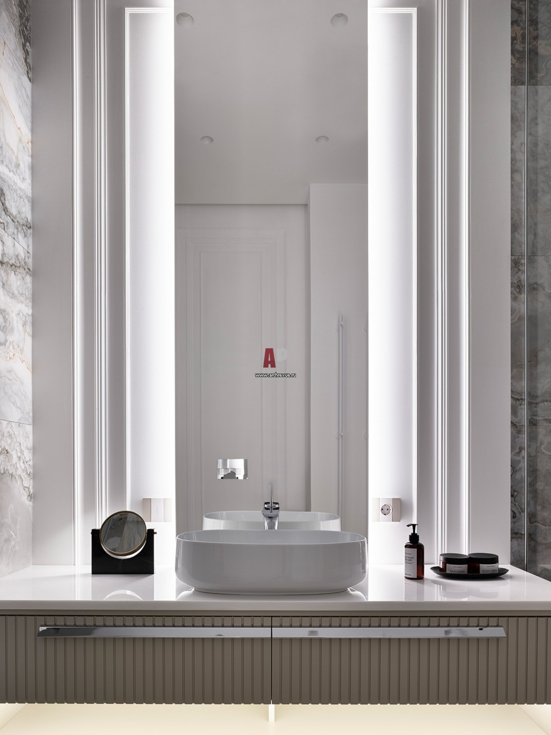 Детский санузел оформлен в светлых серых тонах. Раковина, ArtCeram.
