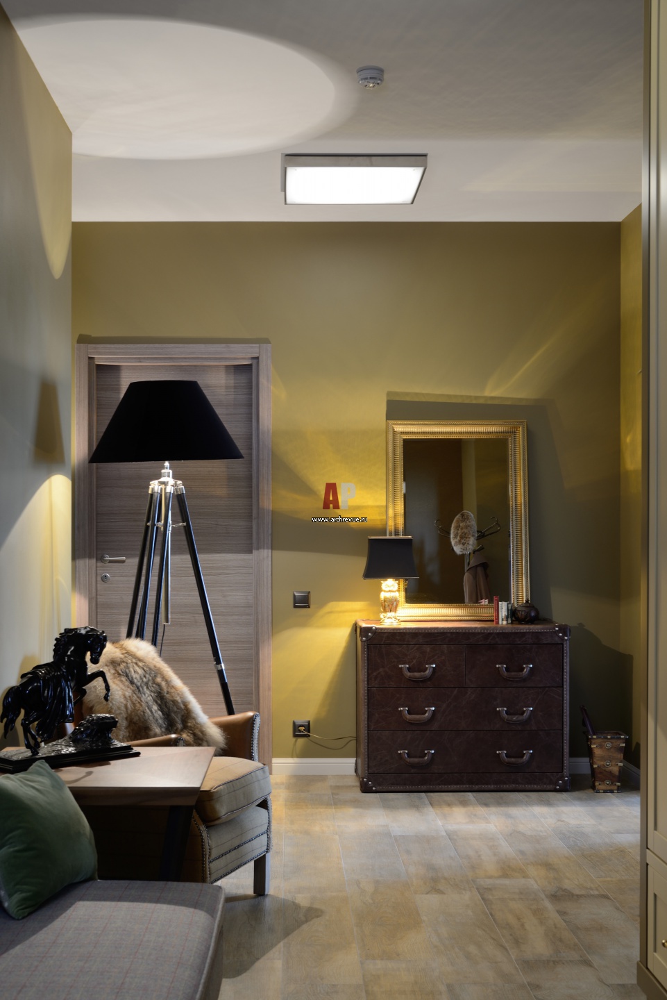 Фото интерьера прихожей в квартире. Помещение меблировано американской мебелью с колониальной тематикой. Комод в виде сундука, Timothy Oulton. Стены отделаны однотонной матовой краской Sikkens, поставщик «Дом Краски / Деко – Эм».