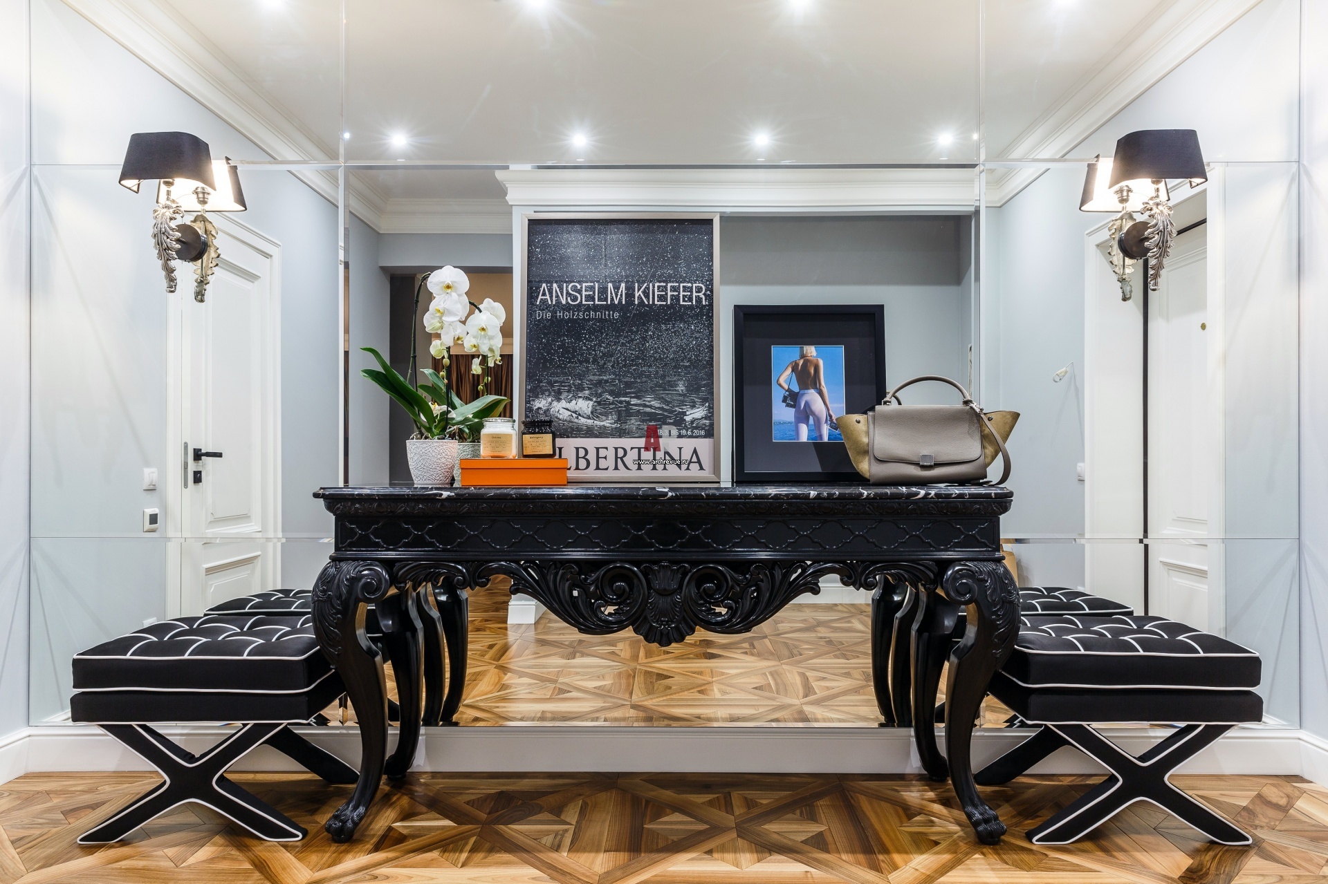 Стена в прихожей оформлена зеркалами. На их фоне особенно интересно смотрится барочная консоль из черного лакированного дерева. Ее особенность – большой масштаб, заданный длинной, около 2-х метров, столешницей из мрамора.