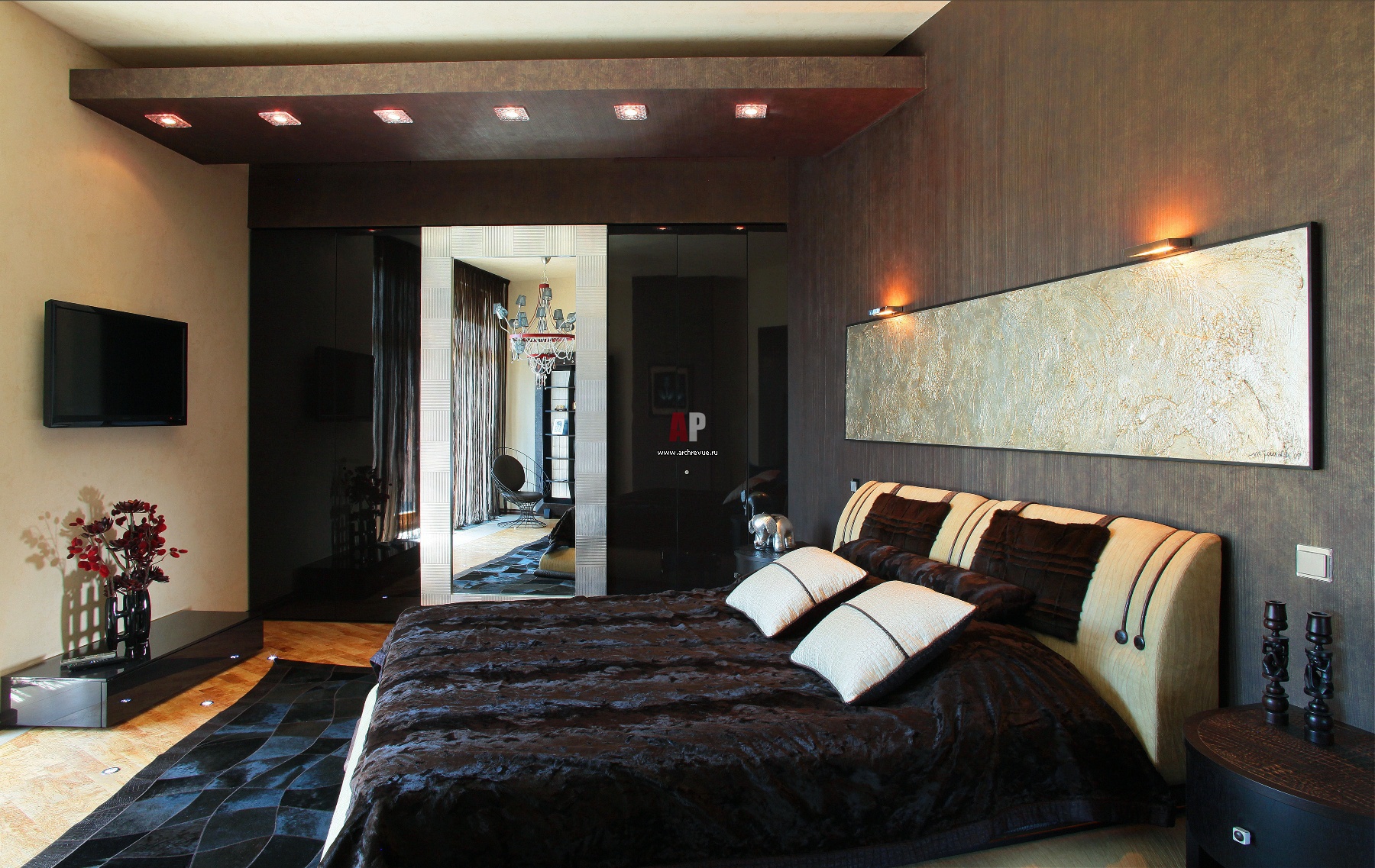 Спальня – помещение не только эффектное внешне, но и функциональное. Вдоль одной из стен вмонтирован встроенный шкаф Besana с черными лакированными фасадами и зеркалом в бронзовой раме. Основательной массивности кровати Smania противопоставлена легкость декора окон. Окна оформлены шторами в виде длинной бахромы, текстильный дизайн «Анива Галери ».