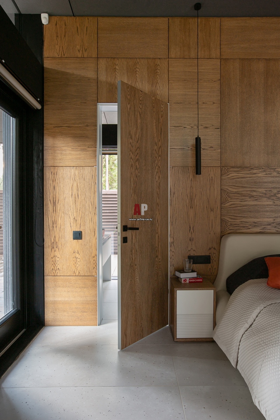 Гостевая спальня с выходом в санузел. Дверь-невидимка встроена в стеновые панели из дерева с натуральной фактурой. Тумба, Osobika. Светильник, SWG. Дверные ручки, Linea Cali, коллекция Corner.
