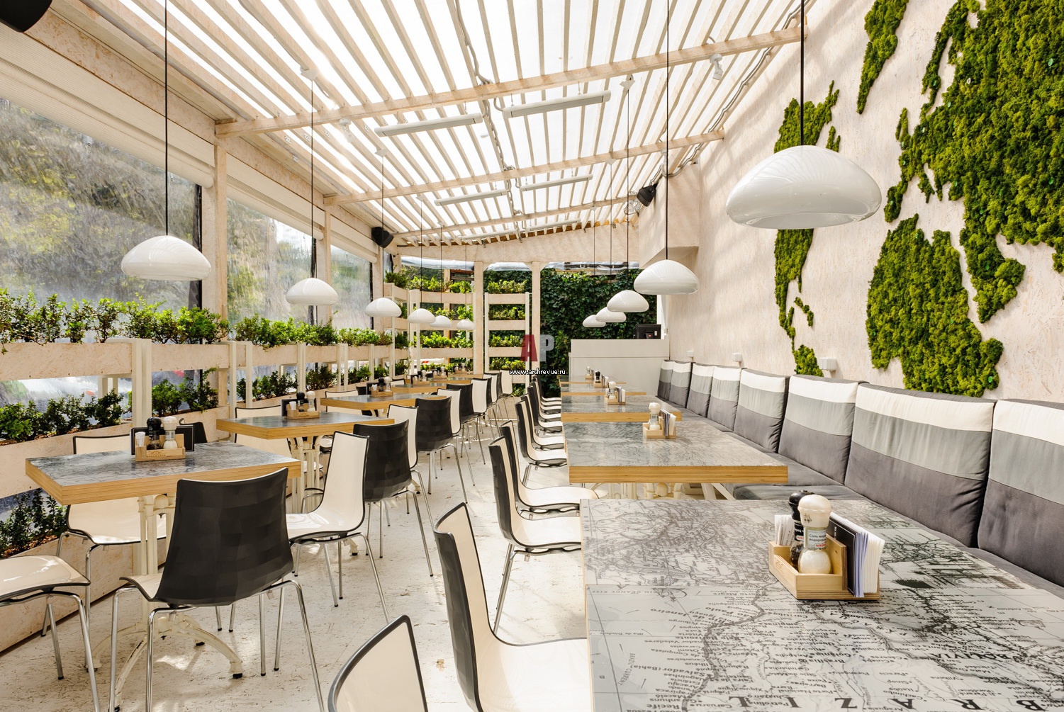 Фото летней веранды при баре. Ее интерьер решен на контрасте с баром: использовано светлое дерево и белый текстиль.