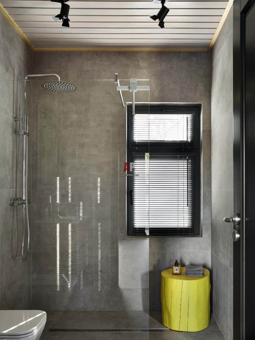 Современный деревянный дом с мужским характером. Интерьер гостевого санузла. Керамогранит, Peronda. Душевая перегородка, Vegas Glass. Раковина и унитаз, Globo. Желтый пенек из кедра, на заказ.