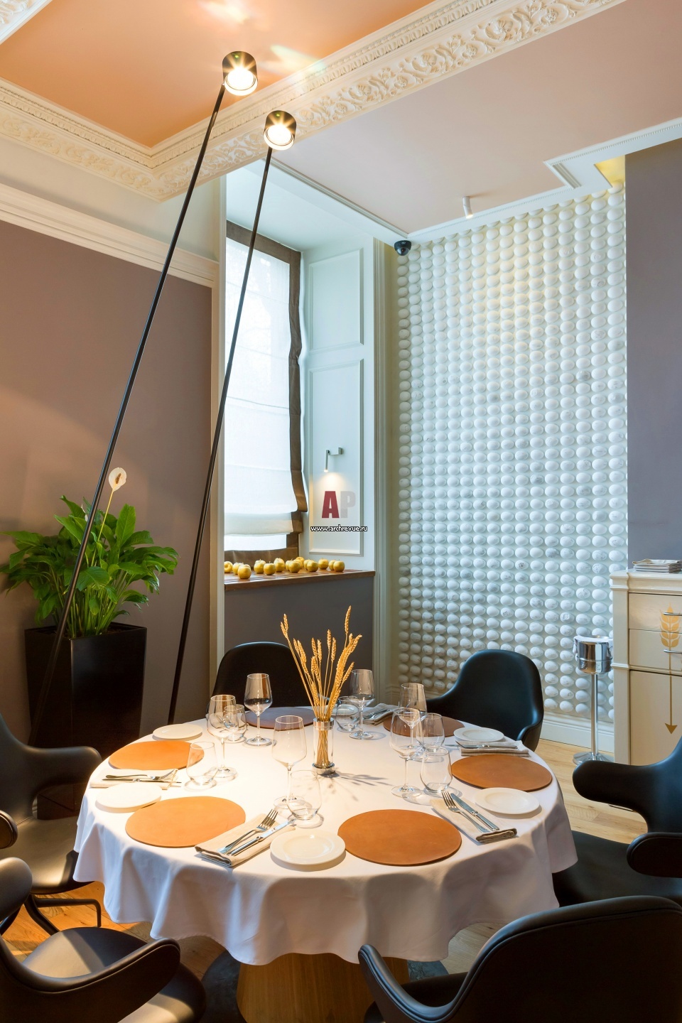 В интерьере использовано множество арт-объектов. Например, одна стена выложена гипсовыми булыжниками.