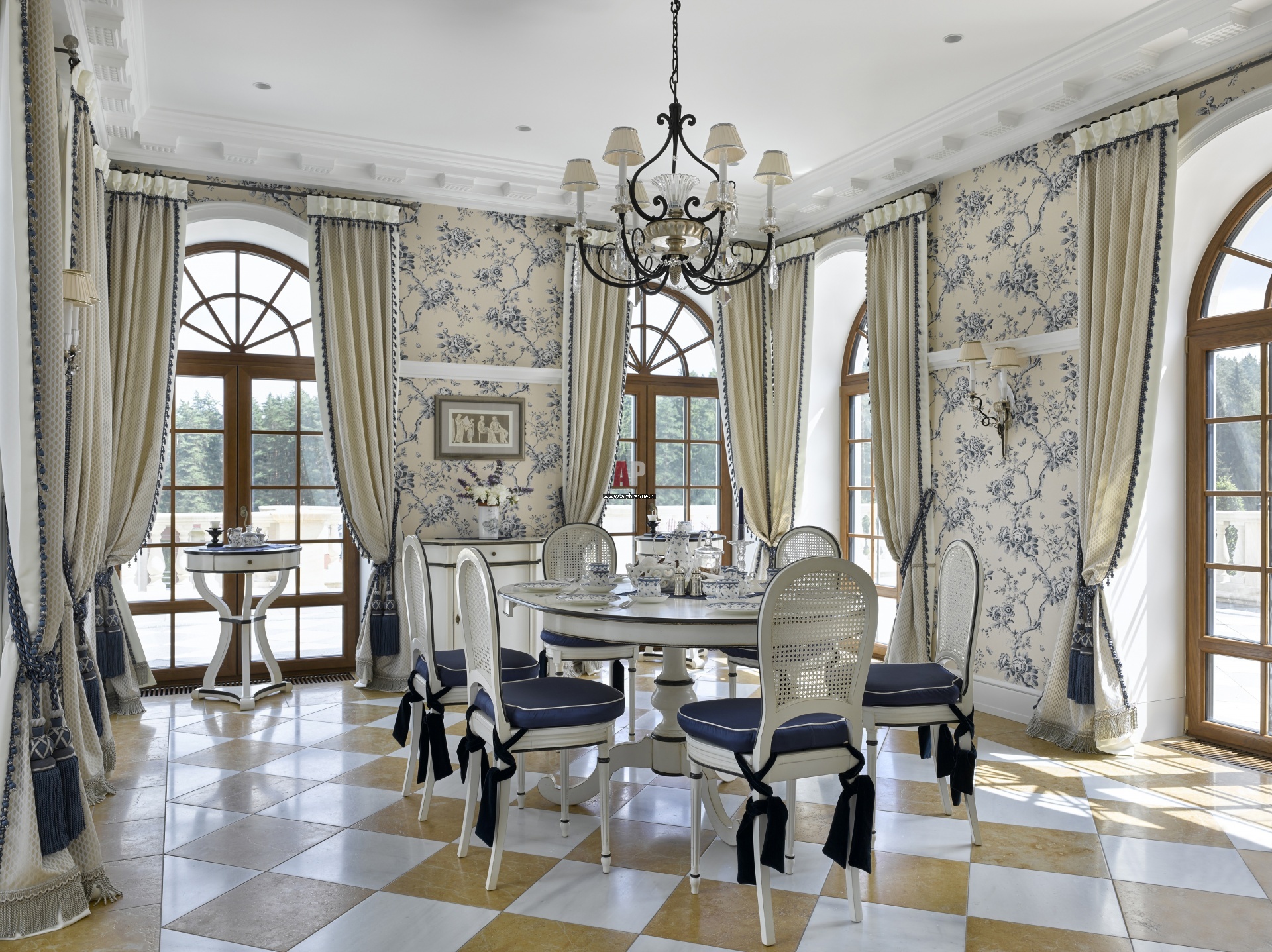 Столовая на террасе решена в виде бельведера. Стол, стулья и консоль, Vittorio Grifoni. Люстра, Banci. Шторы, Gainsborough. Подхваты для штор, Houles.