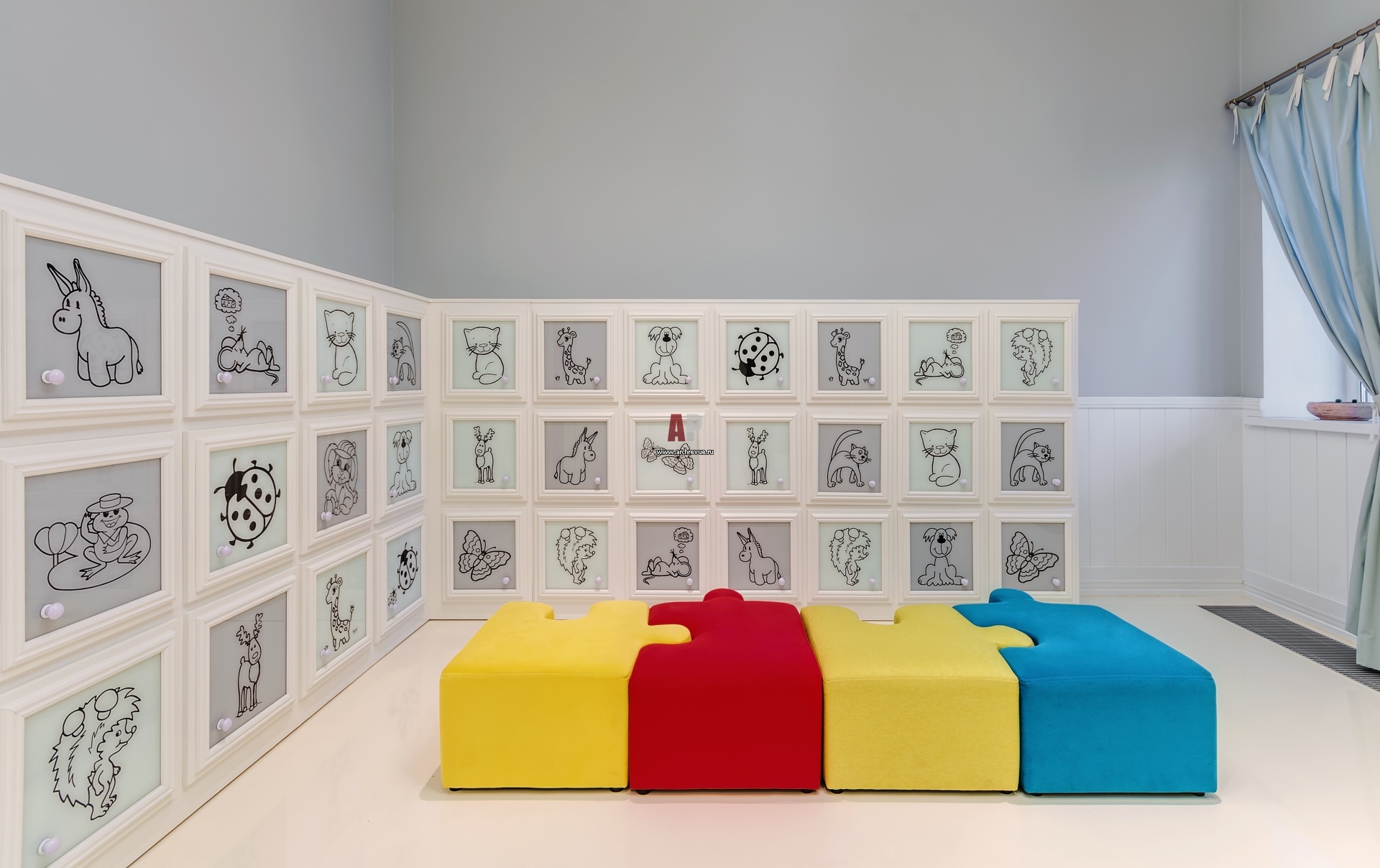 Фото интерьера детского обучающего центра в стиле неоклассика. Раздевалка с личными шкафчиками для хранения.