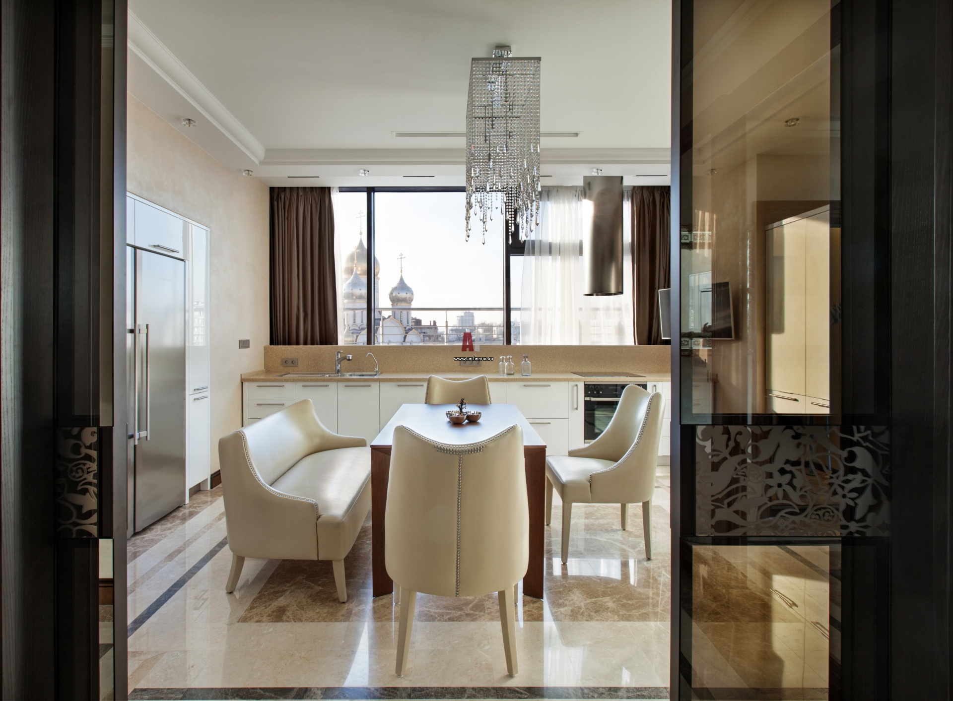 Кухня с двумя парами высоких раздвижных дверей Longhi (расположенными со стороны гостиной и прихожей) занимает центральное положение в квартире и имеет прекрасный вид из окон. Рабочая поверхность расположена вдоль окна с видом на храм. Мебель от Euromobil, поставщик R-Studio.