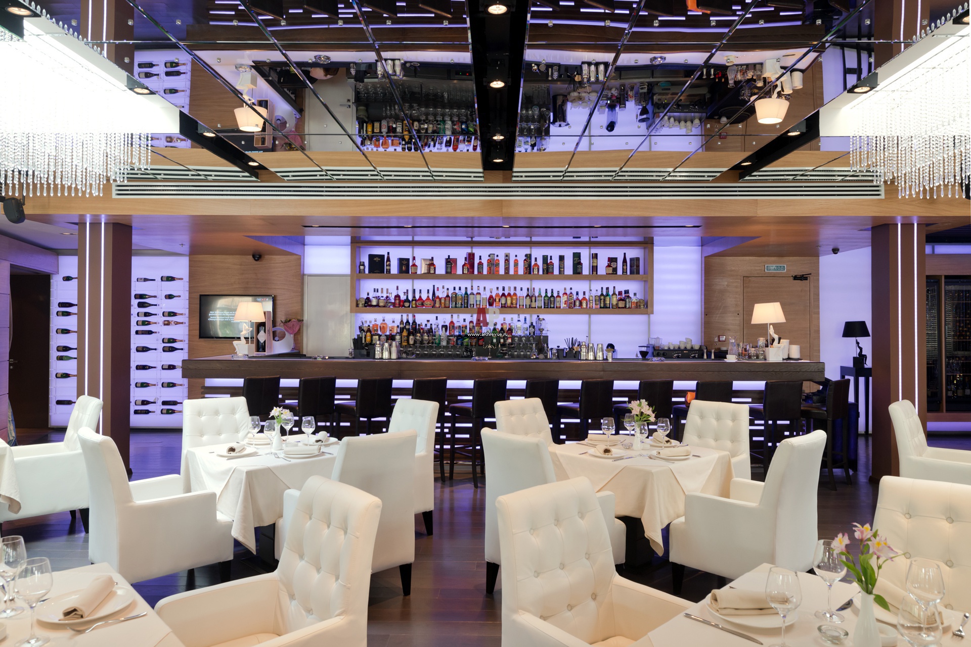На фото – основной зал ресторана. Высоту помещения увеличивают зеркальные потолки. Пространство масштабируют крупные светильники со стразами. Они сделаны по эскизам архитекторов.