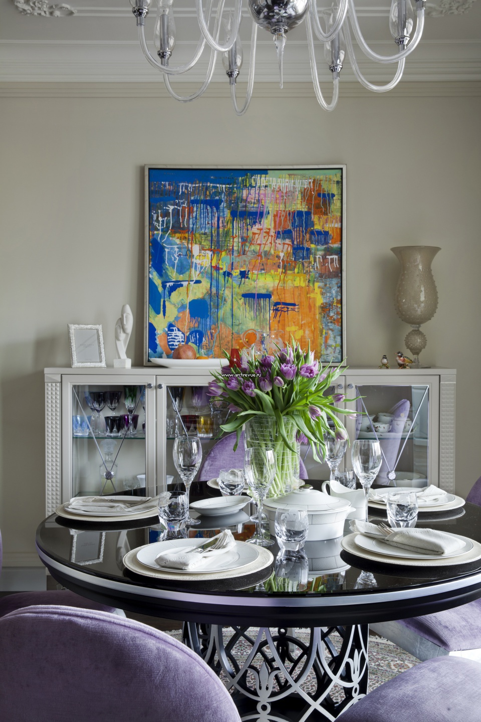 Зона столовой с элементами ар-деко. Круглый стол с резным посеребренным подстольем от F.lli Meroni 1984. Стулья с обивкой цвета лаванды. Все – поставщик «Москва-Рим».