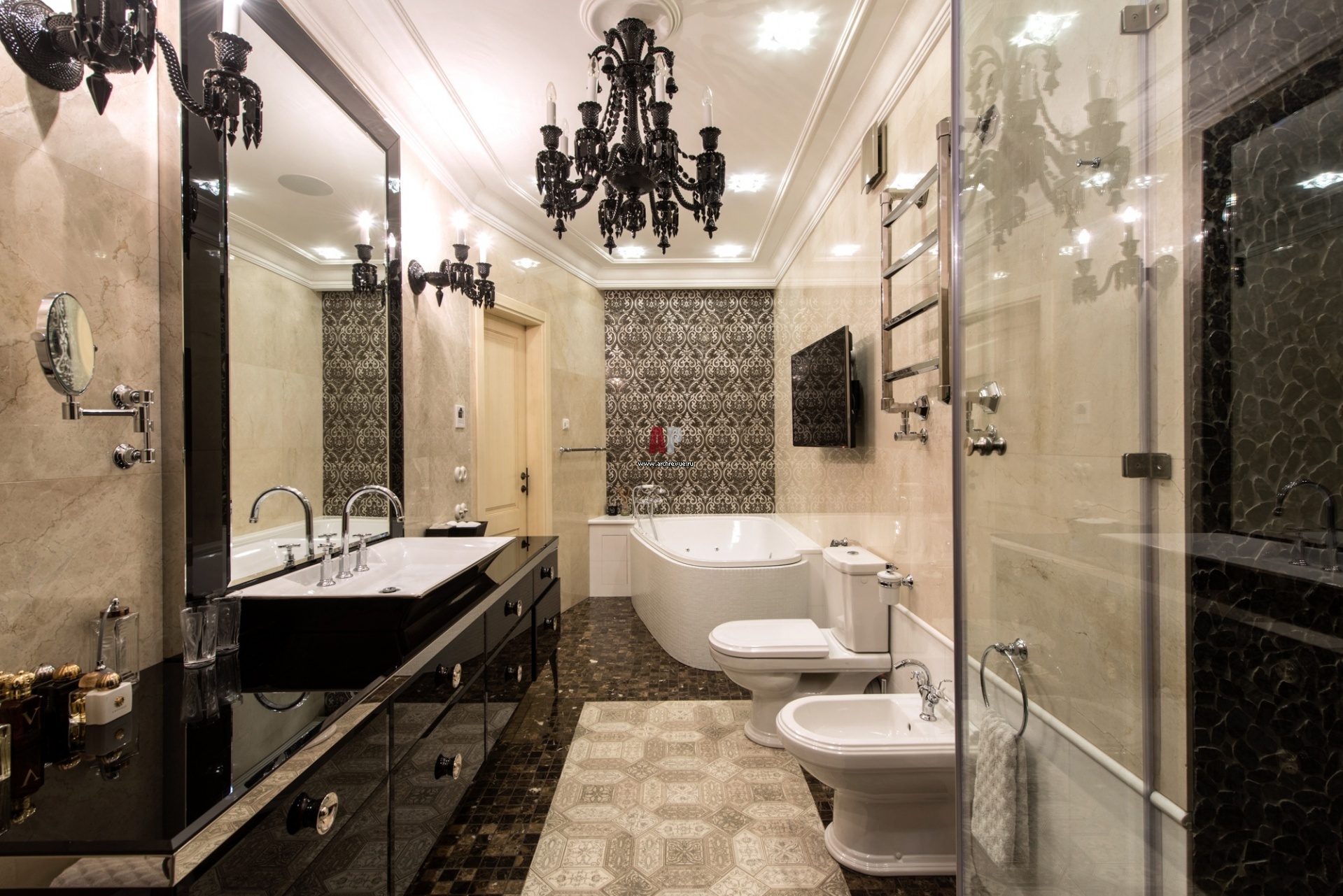 Интерьер черно-бежевого хозяйского санузла выполнен с элементами ар-деко. Мебель для ванных комнат, Milldue. Черные люстры, Baccarat. Рельефная мраморная плитка, Petra Antiqua. Сантехника, Villeroy & Boch, Nicolazzi, Hueppe.