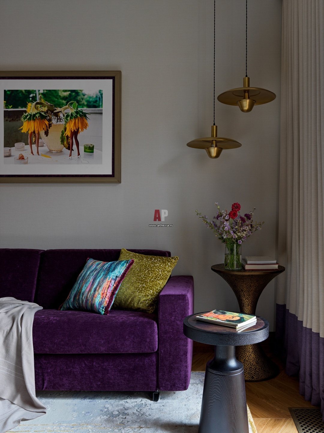 Эстетская квартира для светских приемов. Гостевая комната с фиолетовым диваном, BK Italia. Металлические столики и светильники-подвесы, Hamilton Conte.