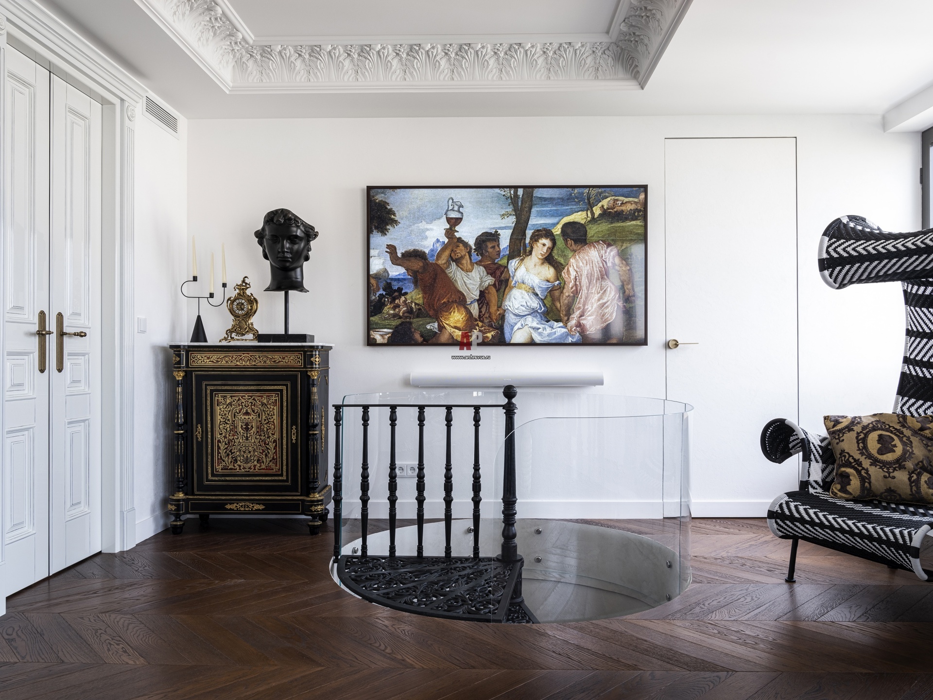 Изначально лестничный проем занимал около 8 кв. м и был крайне неэргономичным. Установка винтовой лестницы, которая заняла 1,5 кв. м, существенно увеличила полезную площадь гостиной на втором уровне.