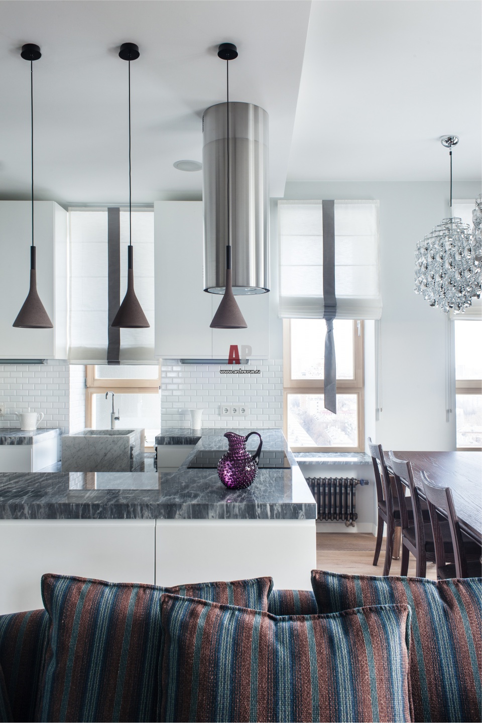 С белыми фасадам кухни контрастирует темно-серый мрамор Bardiglio Imperiale столешниц. Потолочные встроенные светильники, Modular (Бельгия). Потолочные подвесные светильники, Foscarini. Настольные светильники, Eichholtz. Вытяжка над варочной поверхностью в форме цилиндра, Ernestomeda. Поставщик света и мебели – «Москва-Рим».