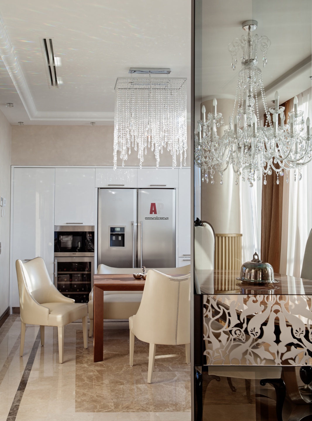 Фото интерьера кухни в стиле ар-деко. Две пары высоких портальных дверей с зеркальными вставками отлично зонируют помещение и в то же время «не съедают» пространство.