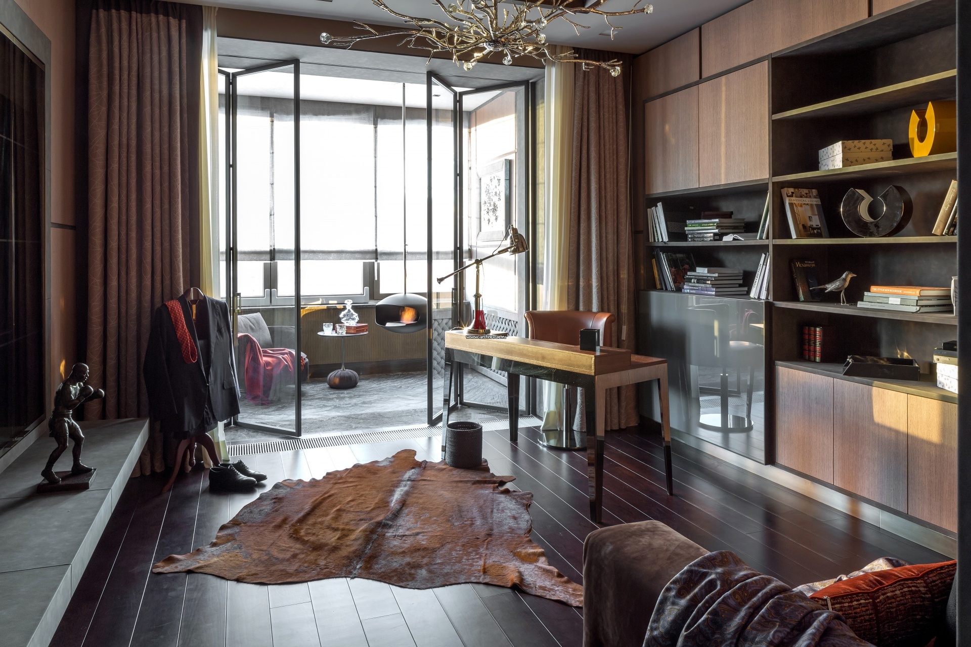 Интерьер кабинета выполнен в стилистике респектабельного ар-деко, он спроектирован с учетом индивидуальных требований хозяина дома. Стеновые и потолочные панели, фасады библиотеки выполнены из дуба. Раздвижные дверцы библиотеки изготовлены из металла и дымчатого стекла, внутри полки обиты нубуком. За письменным столом – лаунж, расположенный на присоединенной лоджии.