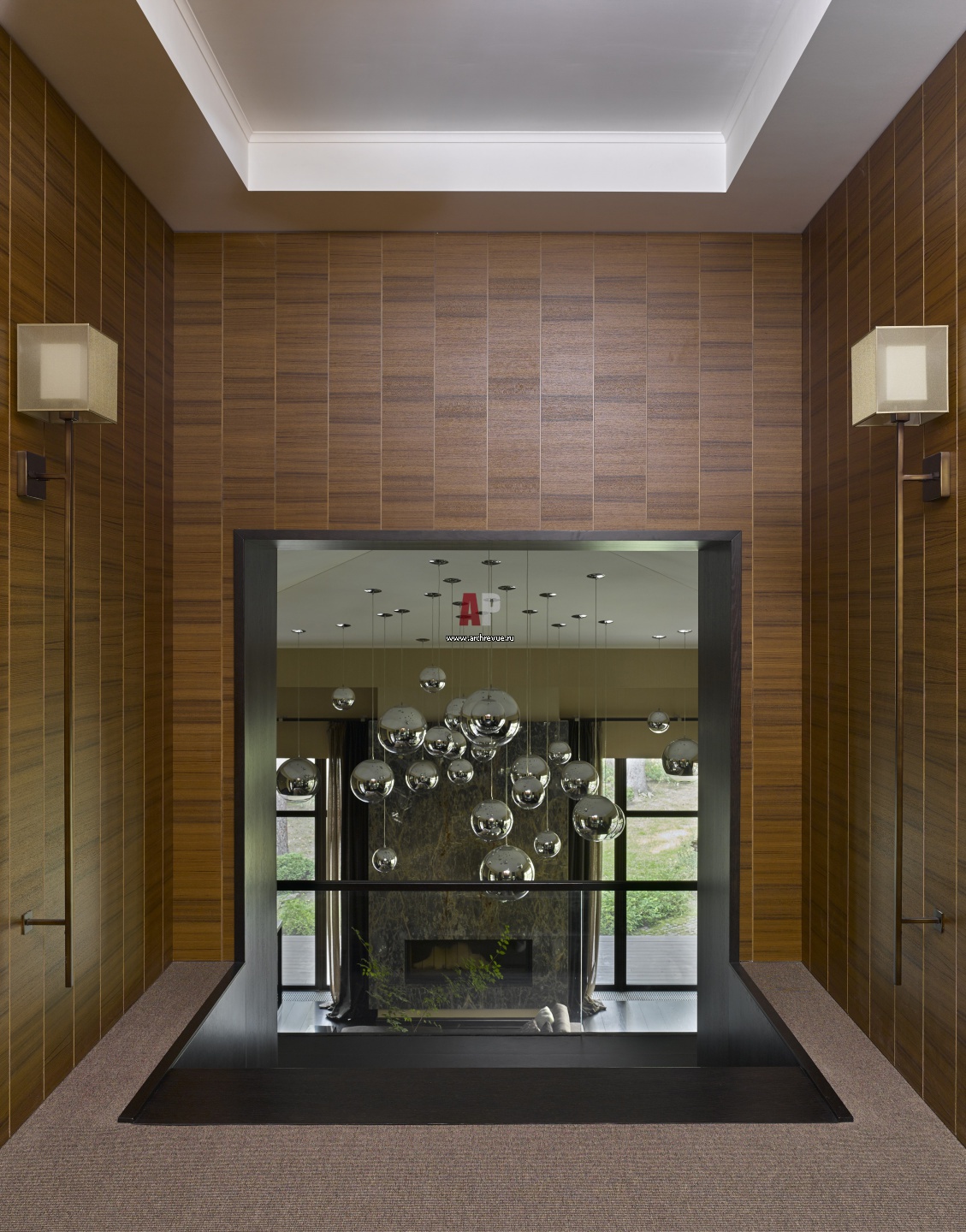 Холл второго этажа. Деревянные панели «утепляют» современный лаконичный интерьер.