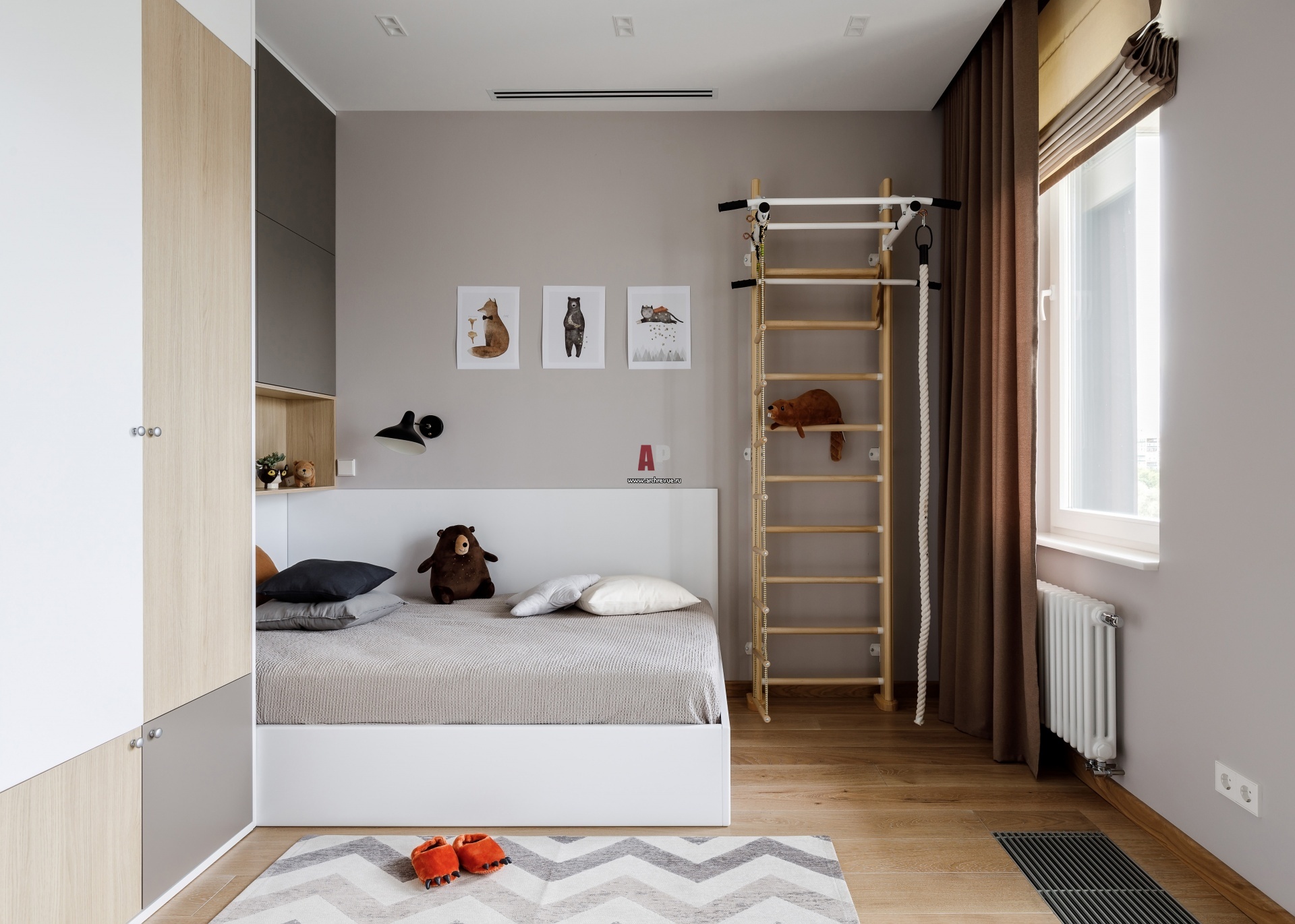 Квартира в скандинавском стиле для семьи. Интерьер детской. Шкафы со встроенной кроватью, на заказ.
