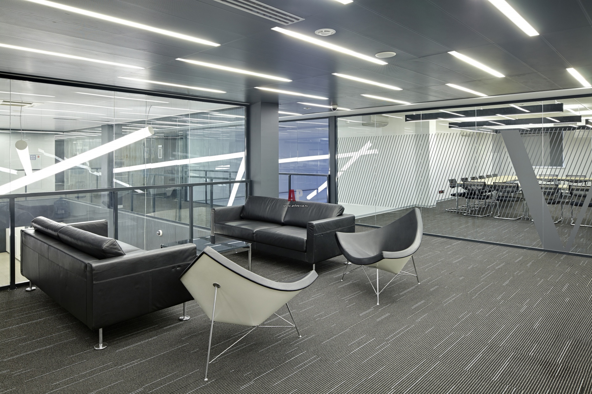 Интерьер обучающего центра Volkswagen выглядит строго за счет черно-белой цветовой гаммы и дизайна в стиле хай-тек.