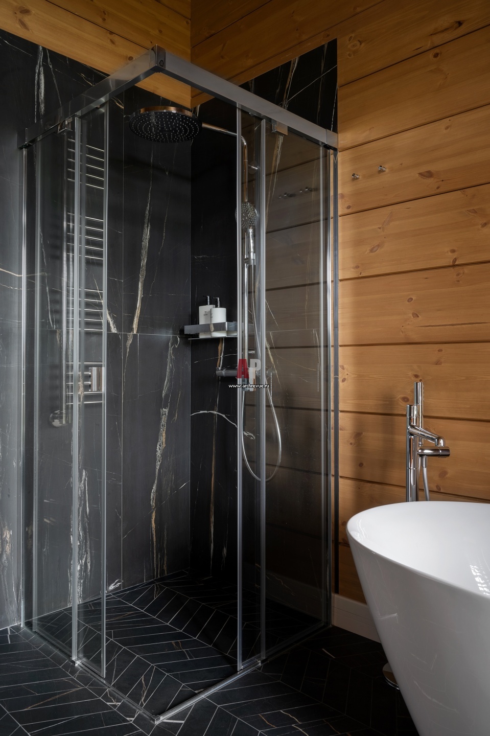 Санузел при мастер-спальне. Деревянная отделка сочетается здесь с черным мрамором, которым выделена душевая кабина.