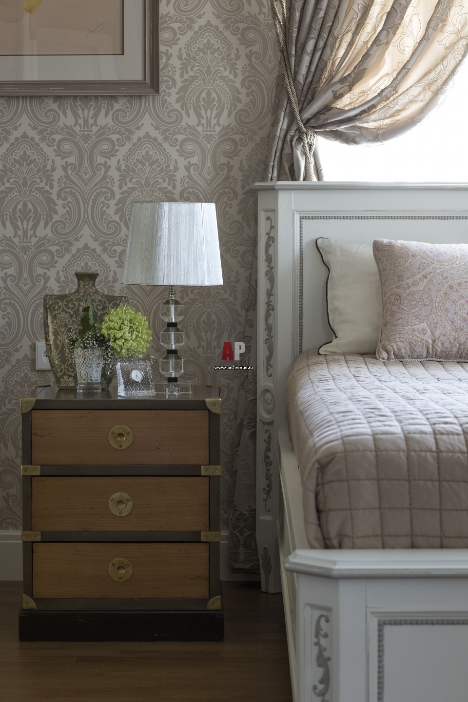 Интерьер спальни в стиле современная классика. Обои с традиционным орнаментом бежево-песочного цвета, поставщик «Ампир Декор».