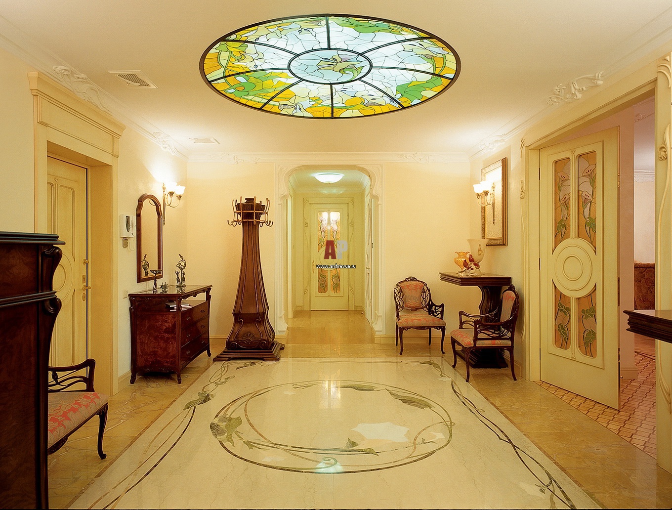 Холл квартиры украшает потолочный витраж – круглый световой фонарь с витиеватыми переплетениями розовых бутонов вьюнка.