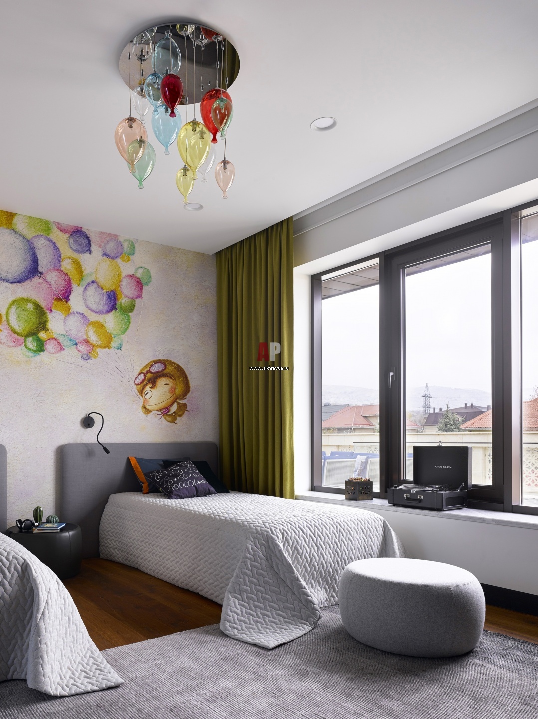 Интерьер одной из детских. Стена за кроватями оформлена обоями ярким принтом, Inkiostro Bianco. Люстра в виде воздушных шаров, Ideal Lux.