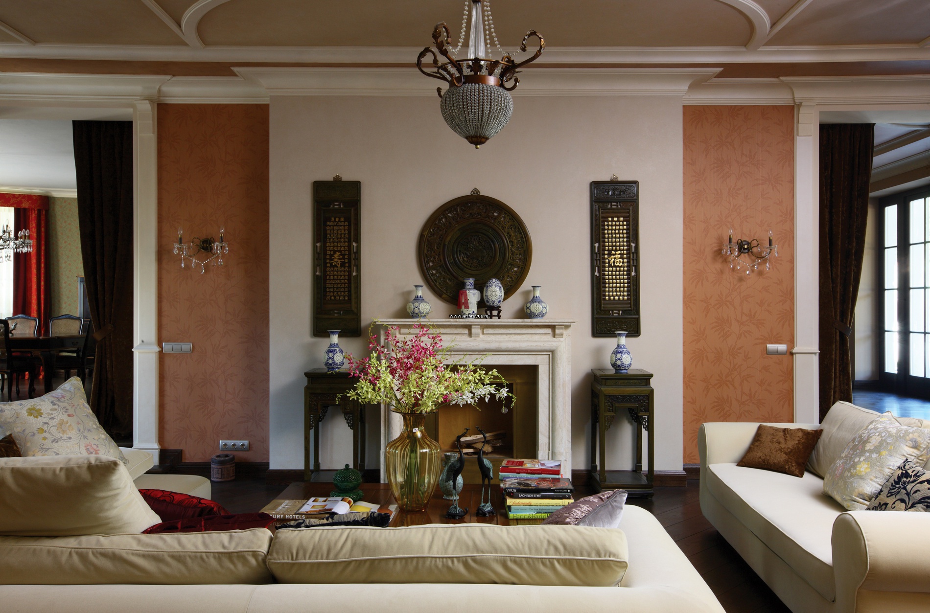 Зона камина в гостиной. Портал камина из белого мрамора с декором из красного дерева, поставщик «Интерьерный салон» («Loki камины»).