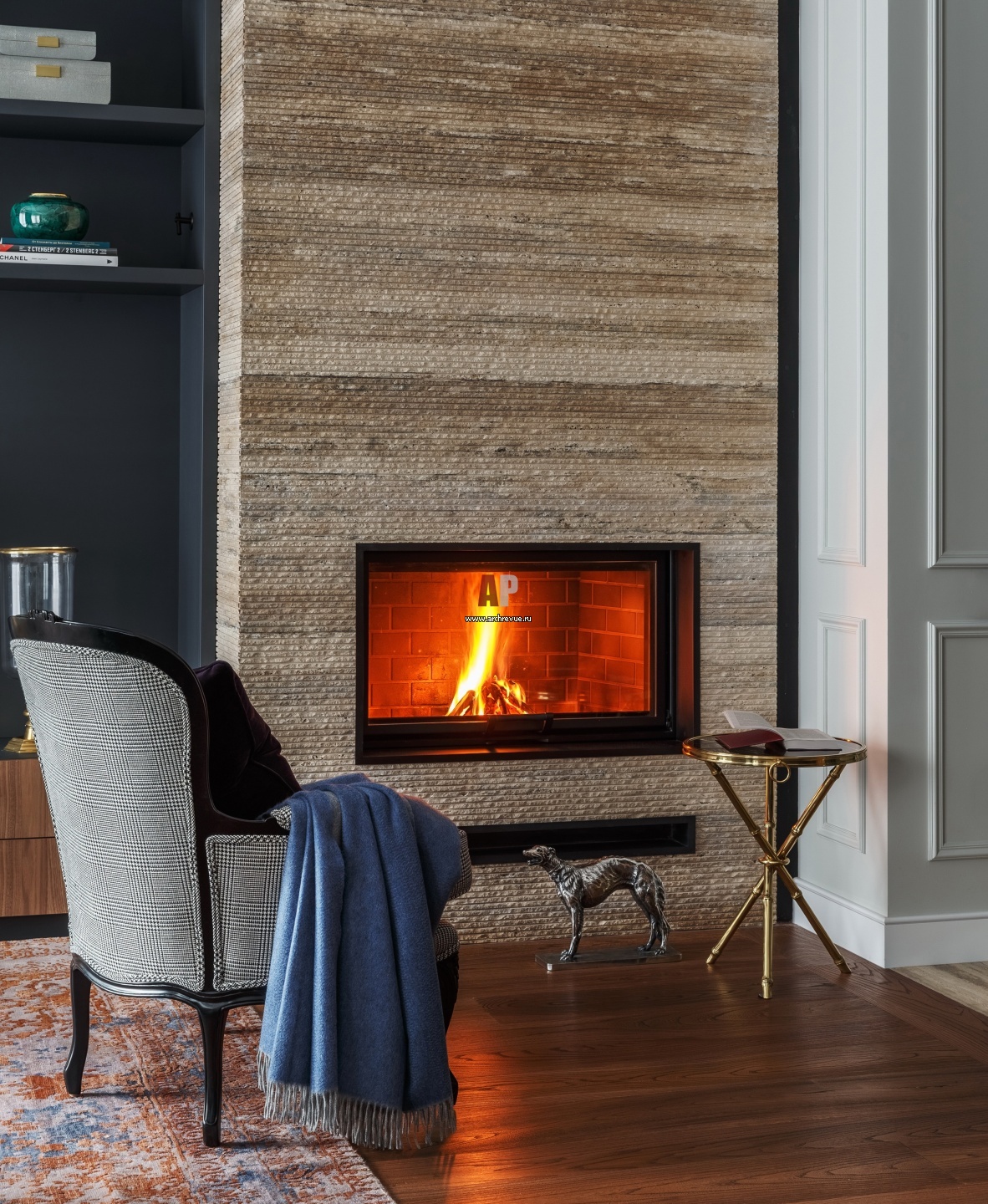 Зона камина в гостиной. Плинтусом из черного металла скрыто место стыка облицовки камина с гипсовым профилем.