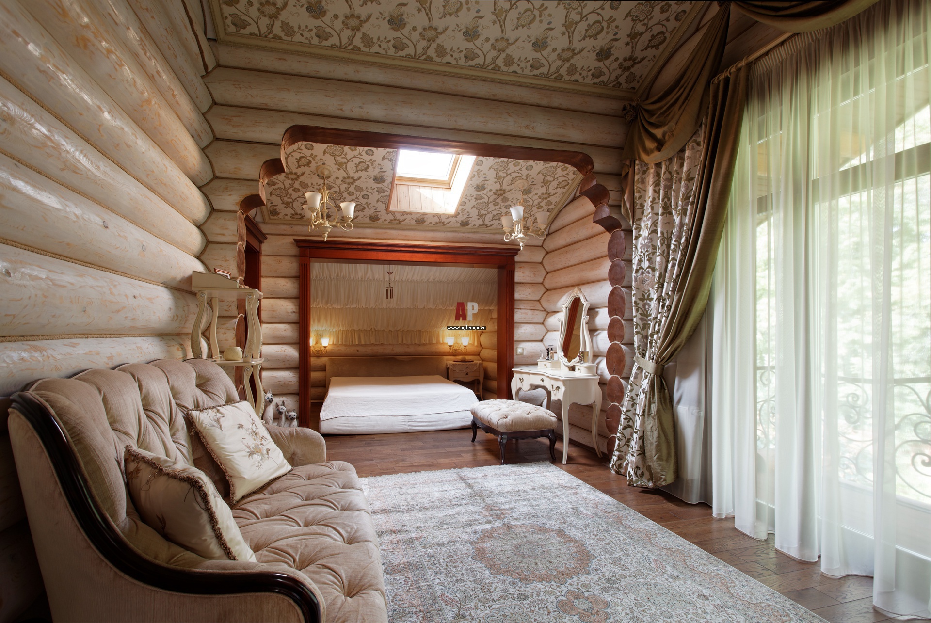 Интерьер спальни в деревянном доме. В алькове расположена кровать. Потолок над ней задрапирован легкими белыми тканями и напоминает паруса.