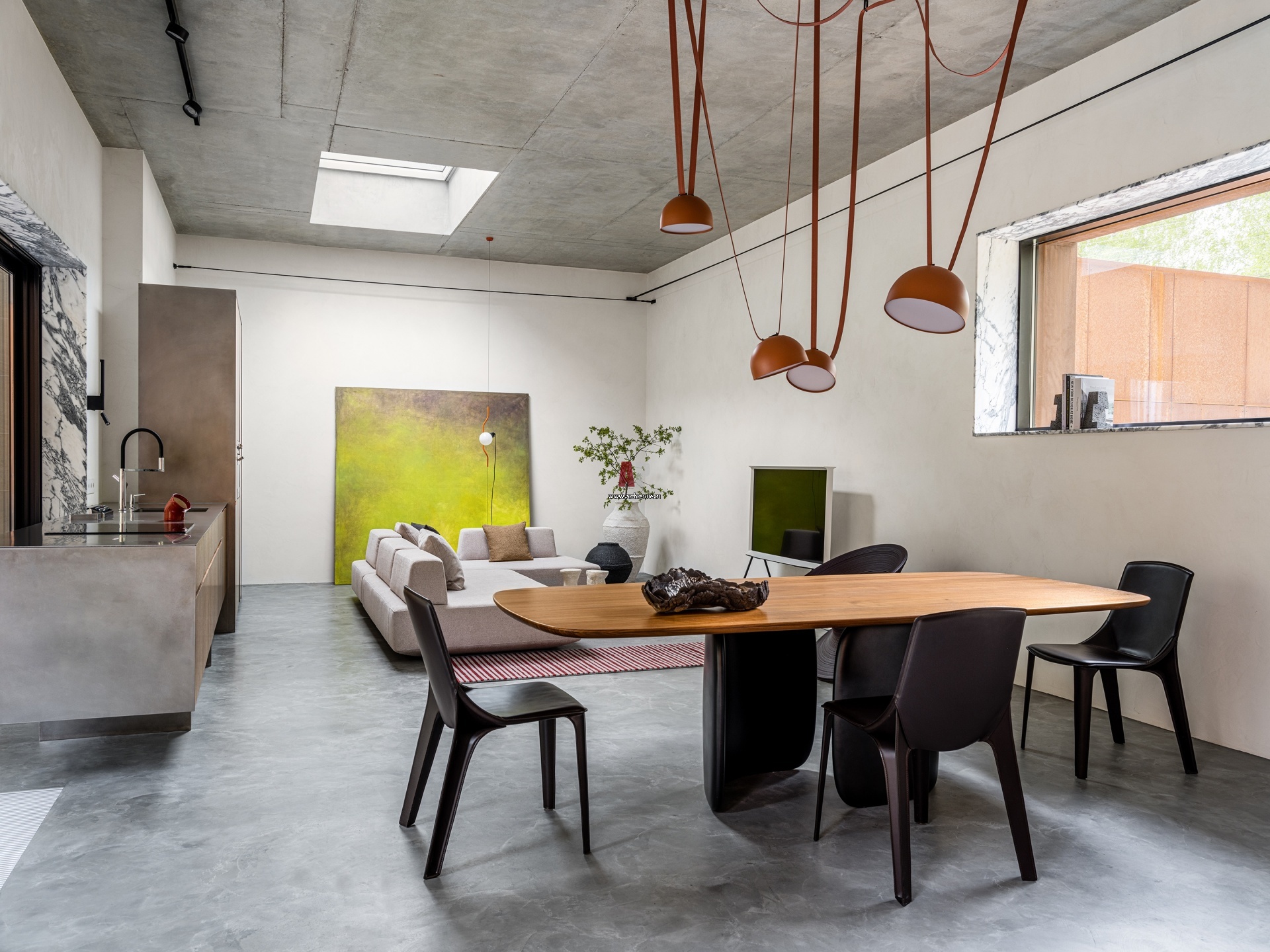 Кухня-гостиная. Диван, Massimo, модель TiTo. Обеденный стол, Bonaldo. Стулья, Fiam. Люстра, Vibia. Торшер, Flos. Откосы окон отделаны итальянским мрамором Arabescato.