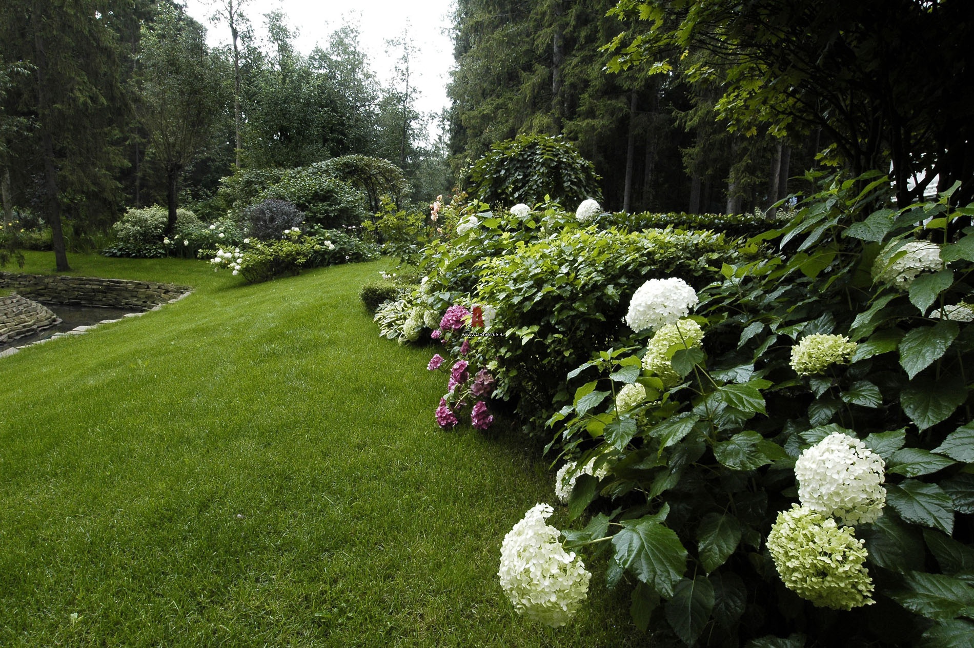 Крупные белые и розовые соцветия гортензии живописно смотрятся на фоне ухоженного газона.