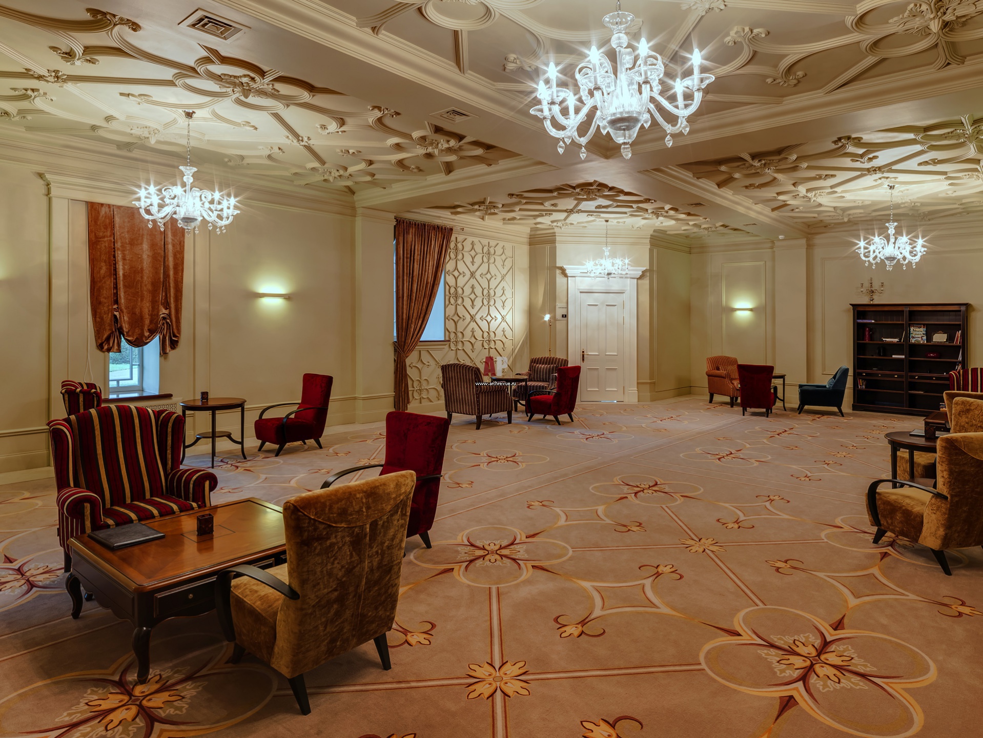 На фото – дизайн интерьера зоны отдыха для топ-менеджеров офисного центра. Потолок испещрен лепным узором с восточным колоритом. Мотив узора повторяется в рисунке ковра.