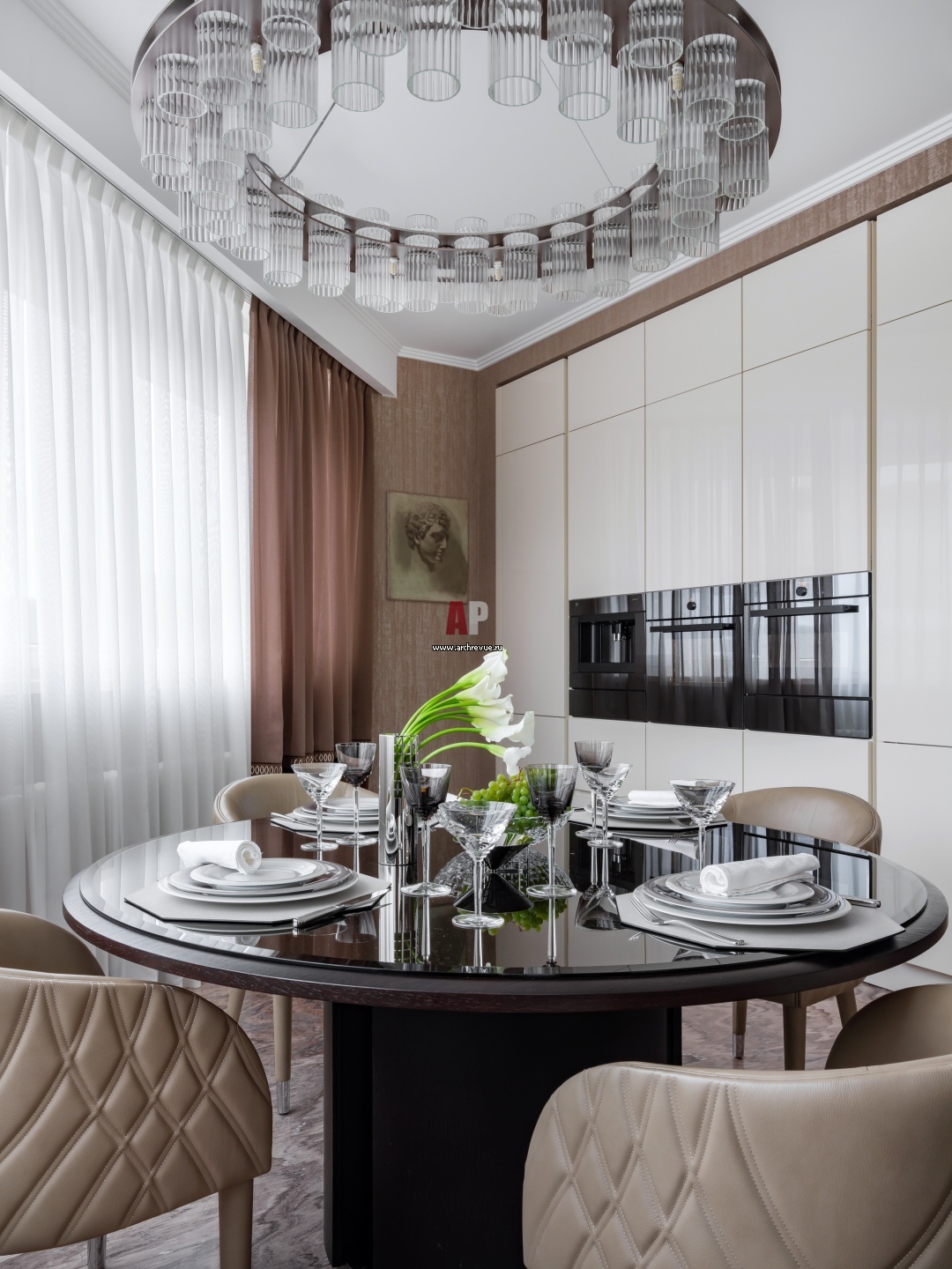 Кухня находится на присоединенном балконе и имеет выход на открытую террасу на крыше. На полу – розовый мрамор. Кухонная мебель, SieMatic.