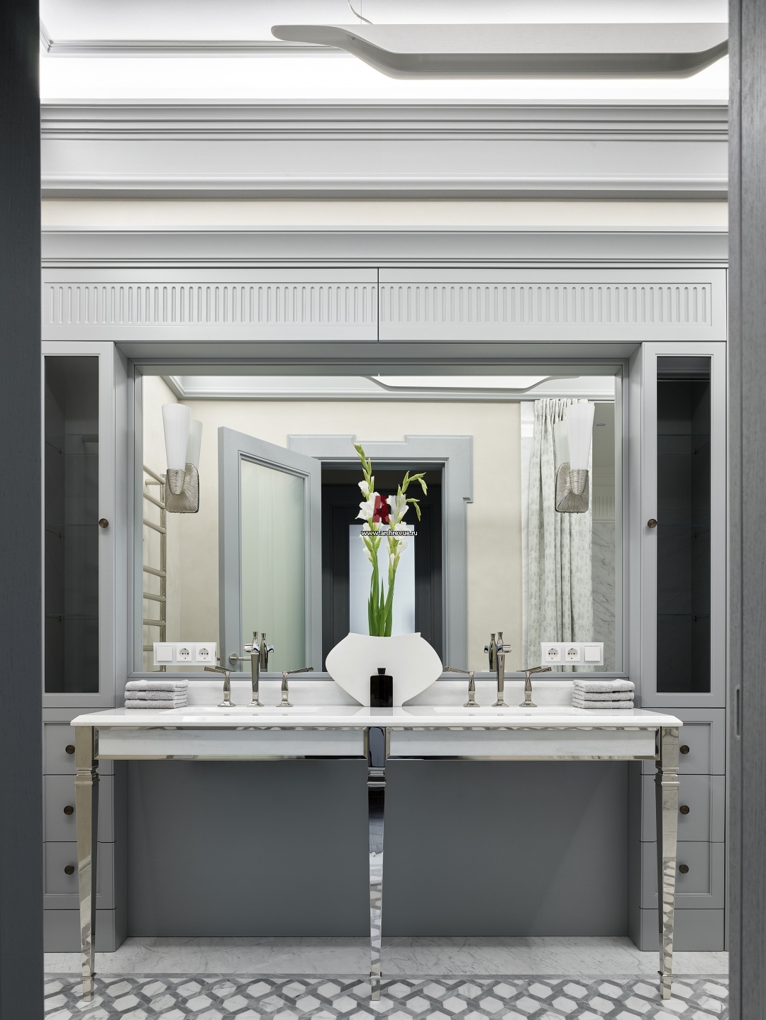 В ванной комнате использовано сочетание натурального камня и окрашенного в серый цвет дерева. Чтобы сохранить прохладную тональную гамму, использована никелированная отделка смесителей и фурнитуры. Умывальник с двумя раковинами, Devon & Devon. Смесители, Zucchetti.