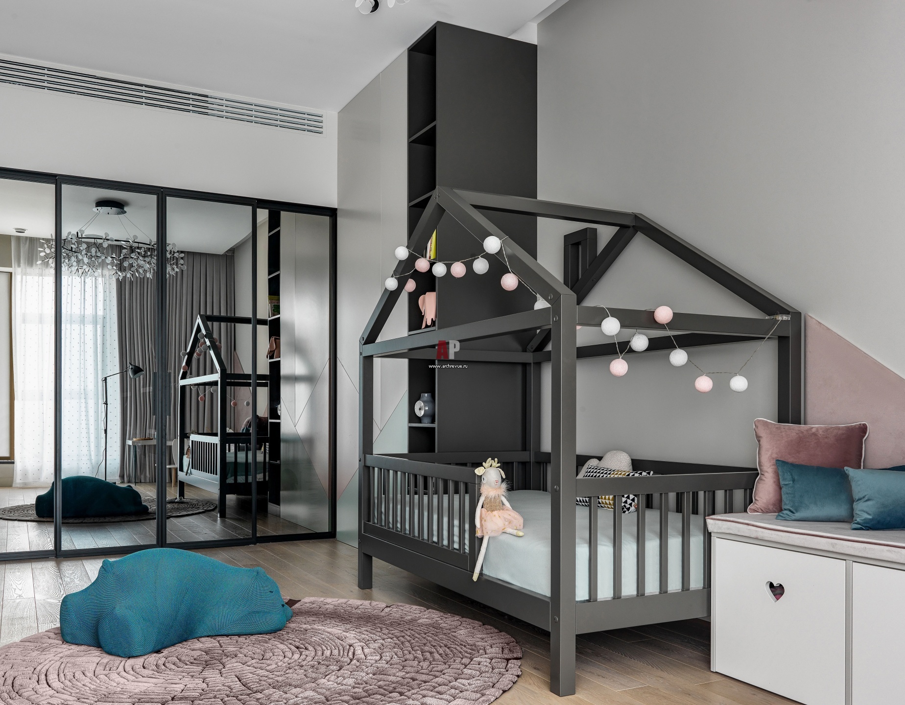 Детская спальня максимально удалена от общей зоны и гостевых помещений. Вся корпусная мебель (кровать-домик, столик с выкатными тумбами для игрушек) сделана по чертежам дизайнеров в Москве. Люстра, MOOOI, Heracleum The Big O. Пуф-медведь, Vitra, Resting Bear.