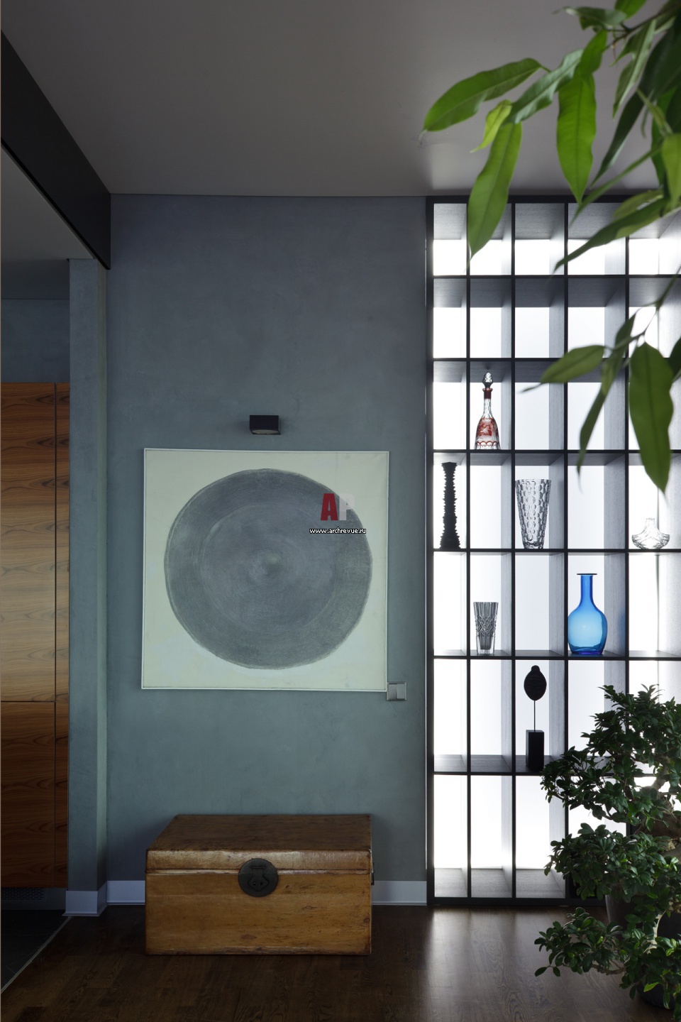 Стены гостиной оформлены декоративной штукатуркой серого цвета, имитирующей бетон. Она имеет приятную на ощупь фактуру и работает на образ экологичного интерьера. Ниша со стеллажами и подсветкой перекликается с огнями большого города. Картина работы художницы Екатерины Рожковой сделана в технике карандаша.