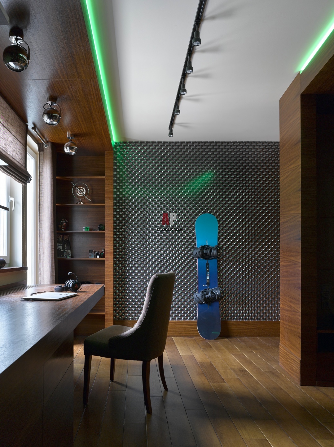 Детская комната мальчика. Письменный стол, встроенные шкафы, потолочные панели сделаны на заказ.