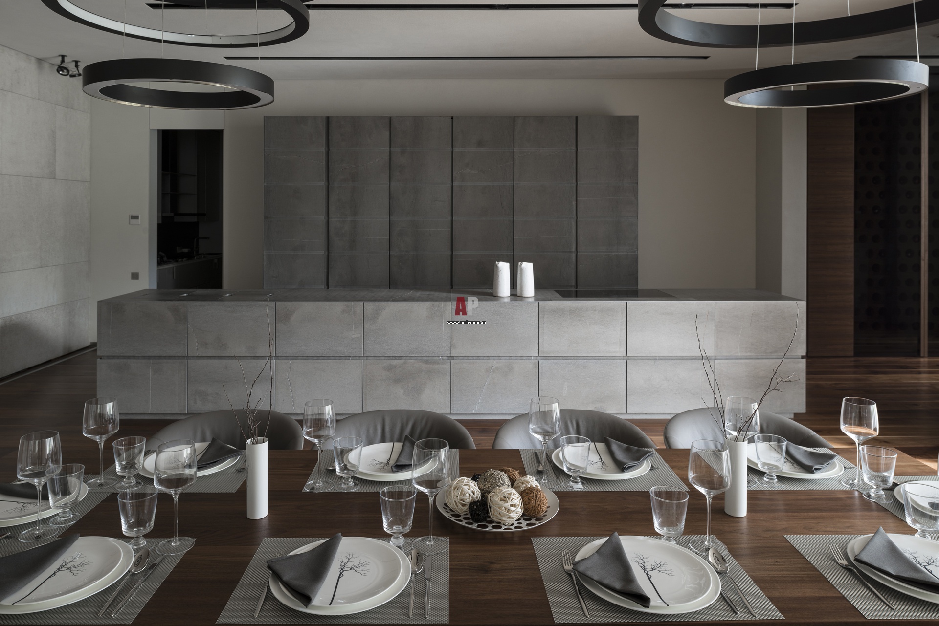 Парадная кухня в интерьере столовой. Минималистский кухонный гарнитур Matteo Gennari отделан серым камнем.