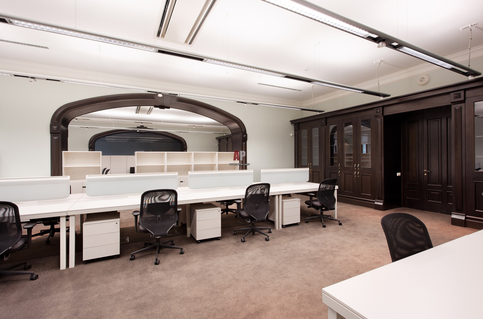 Рабочая зона находится в реконструированном мансардном этаже. Классическая линия задана деревянным панелированием стен и отделкой деревом арочных дверных проемов.